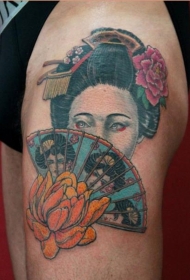 小臂亚洲传统色彩的艺妓生首纹身图案