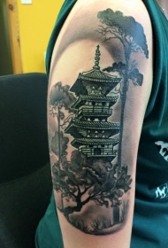 大臂黑灰武士结合亚洲建筑纹身图案