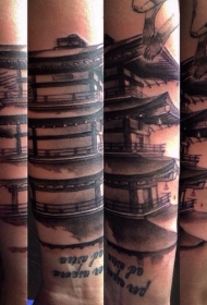 手臂亚洲建筑结合字母纹身图案