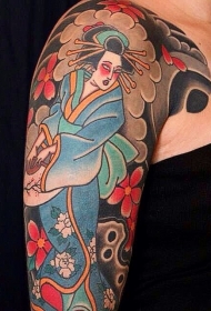 大臂亚洲风格的彩色舞蹈艺妓个性纹身图案