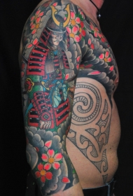 手臂和胸部亚洲风格彩色武士花朵纹身图案