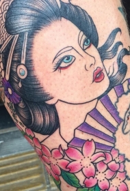 小腿复古风格的五彩亚洲艺妓和花蕊纹身图案