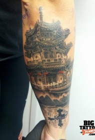 小腿彩色的亚洲寺庙与盛开的花朵纹身图案