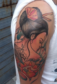 古典油画般的彩绘艺妓扑克牌大臂纹身图案