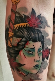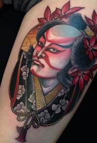 小腿逼真的彩色美丽亚洲女性肖像和花朵纹身图案