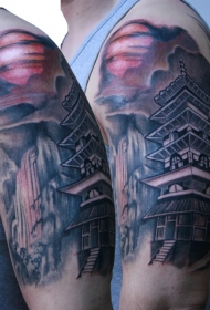 大臂油画般的亚洲山脉树林寺庙纹身图案