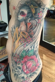 侧肋old school五彩的亚洲女人花朵纹身图案