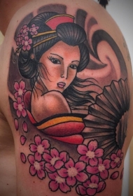大臂迷人的性感亚洲艺妓和樱花纹身图案
