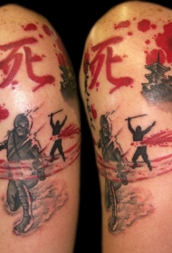 大臂亚洲主题色的血腥战斗与汉字纹身图案