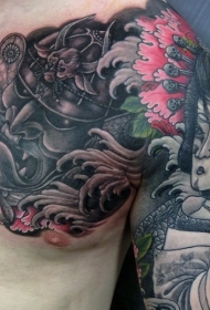 胸部和手臂大规模的彩色龙与武士面具纹身图案