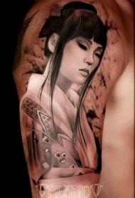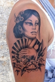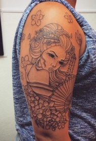 手臂黑色美丽的亚洲艺妓与花朵扇子纹身图案