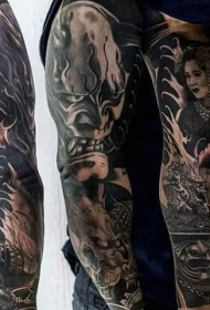 手臂亚洲风格的黑白武士面具和艺伎纹身图案