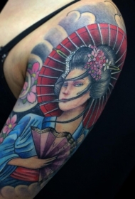 带雨伞的亚洲艺妓彩色大臂纹身图案