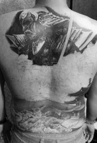 背部惊人的亚洲武士与老房子和鲜花纹身图案