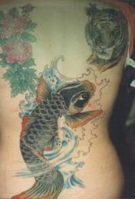 背部逼真的锦鲤鱼与花朵老虎纹身图案
