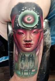 大腿漂亮的彩色逼真亚洲艺妓肖像纹身图案
