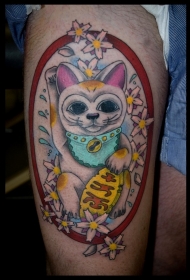 亚洲卡通风格的彩色猫与莲花纹身图案
