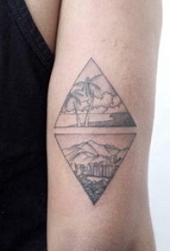 男生手臂上黑色点刺几何简单线条椰树和建筑风景纹身图片