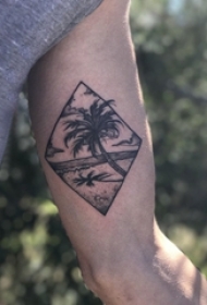 男生手臂上黑灰点刺几何简单线条植物椰树风景纹身图片