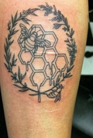 小腿上黑白灰几何元素圆形叶子花边和小动物纹身图片