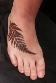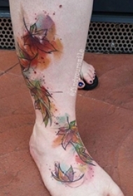 女生脚背上彩绘水彩文艺小清新树叶纹身图案