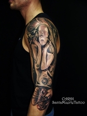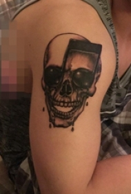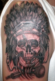 大臂黑灰印度骷髅与麦克风纹身图案