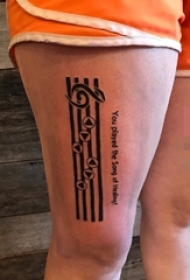 女生大腿上黑色线条五线谱音符纹身图片