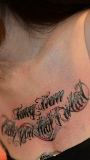 女生前胸精致的奇卡诺花体字母纹身图案