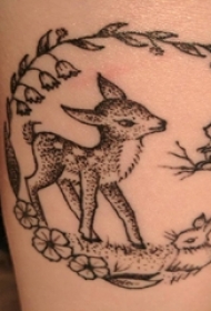 女生小腿上黑色植物素材圆形花边小动物纹身图片