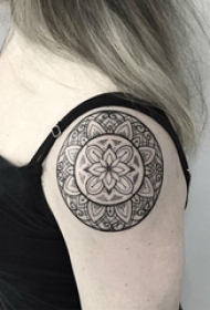 女生手臂上黑色点刺几何线条圆形花朵纹身图片