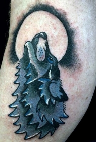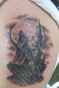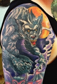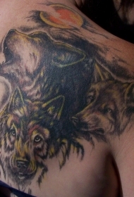 肩部彩色月亮下的狼纹身图片