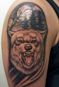 肩部棕色狼在黑暗的森林纹身图案
