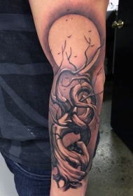 插画风格的彩色月亮枯树纹身图案