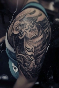 肩部黑灰色老虎与月亮纹身图案