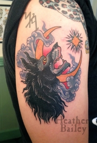 肩部old school彩色狼与月亮纹身