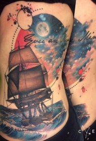 腰侧彩色大帆船月亮纹身图案
