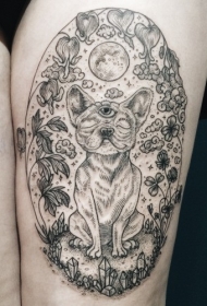 神秘的狗肖像与各种花和月亮纹身图案