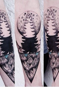 小臂点刺彩色大月亮与树木和森林动物纹身图案