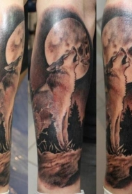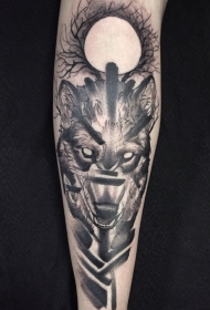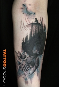 手臂雕刻风格黑白骷髅森林和月亮纹身图案