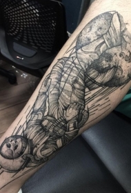 小腿黑色点刺雕刻风格死亡太空员与月亮纹身图案