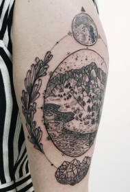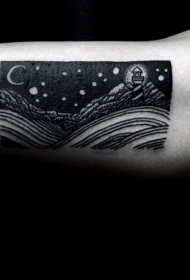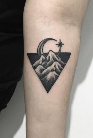 大臂内侧黑色的山区和月亮灯塔纹身图案