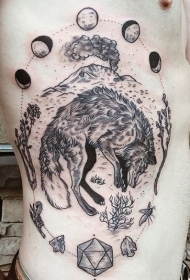 侧肋惊人的黑色睡眠狐狸和月亮周期纹身图案