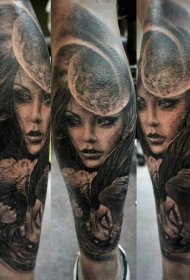 小腿黑灰风格神秘的女人与月亮纹身图案