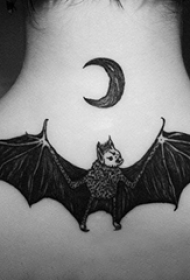 女生颈后黑色点刺简单线条月亮和蝙蝠纹身图片