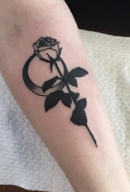 女生手臂上黑色点刺简单线条月亮和植物玫瑰纹身图片