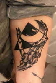 男生手臂上黑色几何简单线条简笔山脉和月亮纹身图片