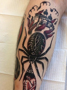 男生手臂上黑灰点刺技巧抽象线条蜘蛛纹身图片