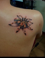 右后肩红色斑斓的逼真大蜘蛛刺青