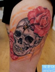 一款腿部骷髅玫瑰蜘蛛纹身图案