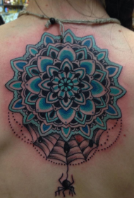 背部好看的蓝色梵花与小蜘蛛纹身图案
